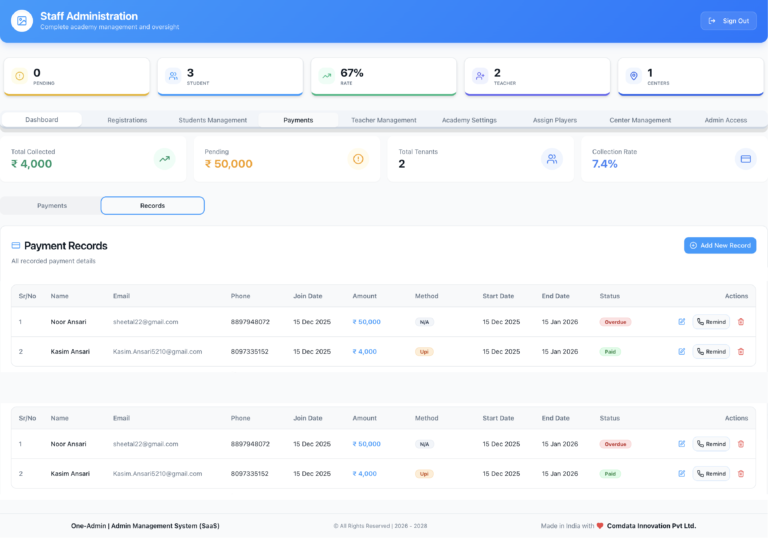 One Admin is an all-in-one platform to manage your academy’s fees, students, and operations — without manual follow-ups.