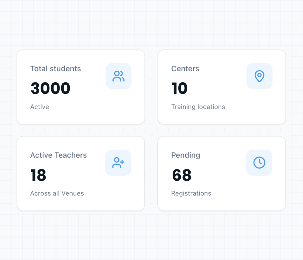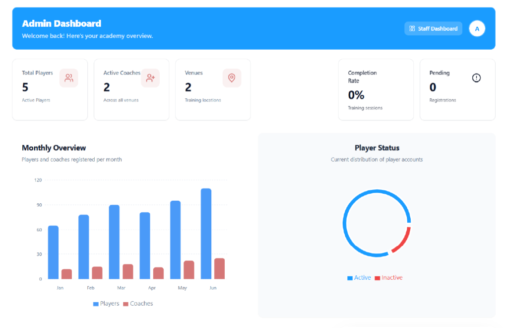 Tired of juggling attendance, staff coordination, and daily reports across tools? The Admin & Staff Dashboard brings operations, tracking, and reporting into one unified system — giving you real-time visibility and complete control over day-to-day academy activities.