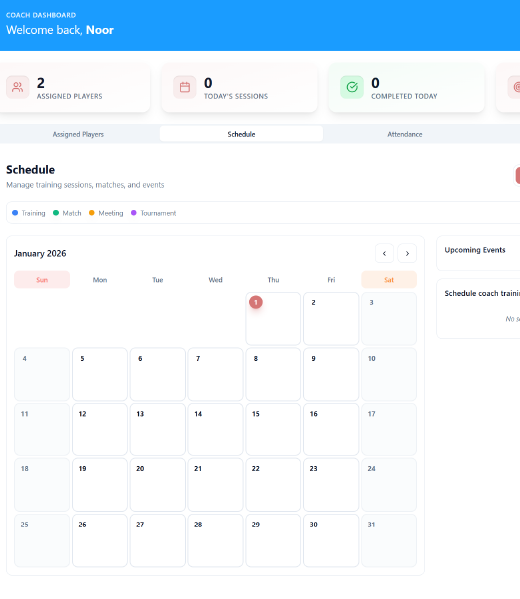 Tired of managing attendance, performance, and session plans manually? Our Coach Dashboard provides complete visibility into player attendance, fee status, and progress tracking—helping coaches focus more on training and results.